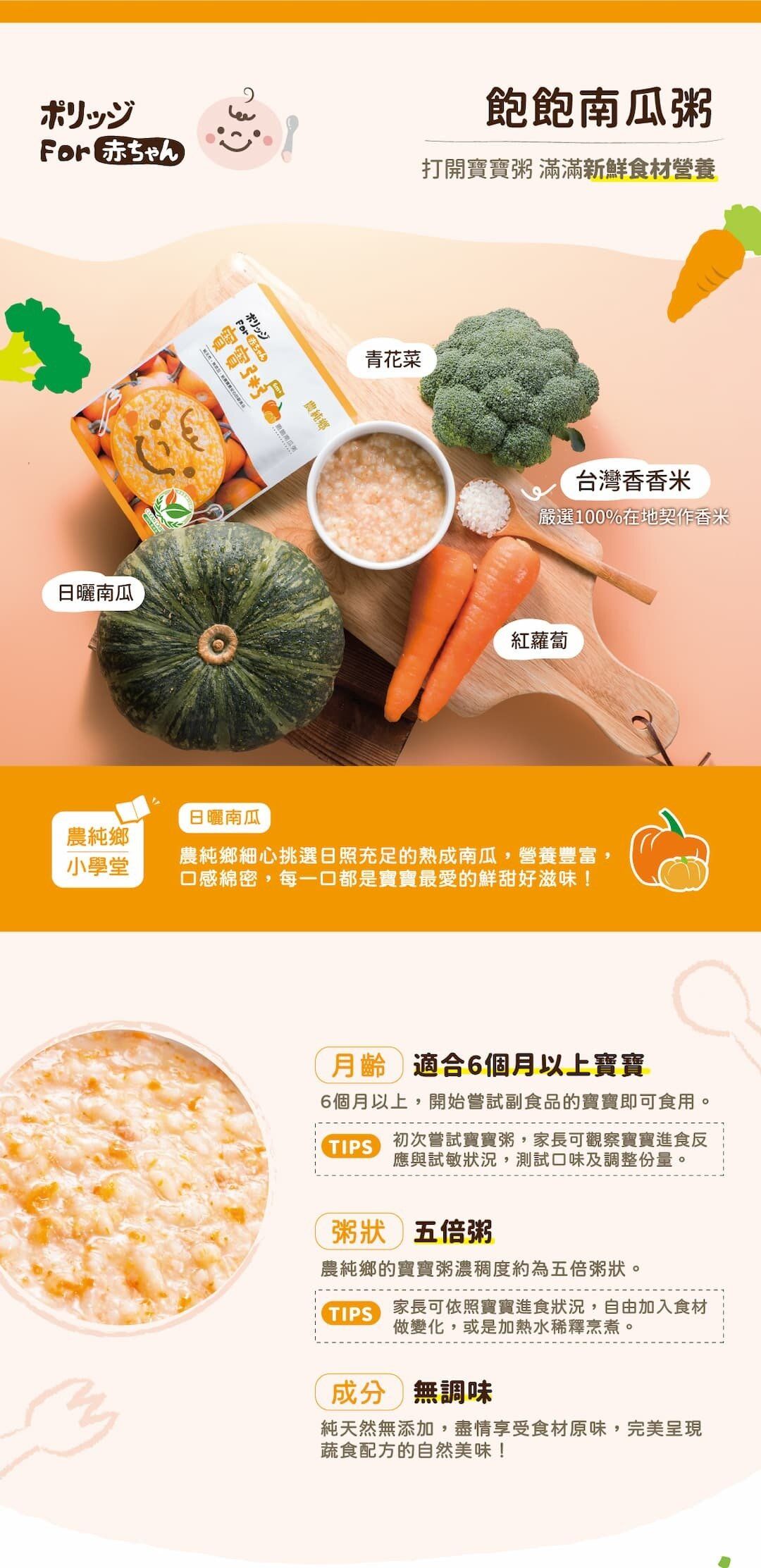 成份:水、南瓜、台灣香米、紅蘿蔔、青花菜