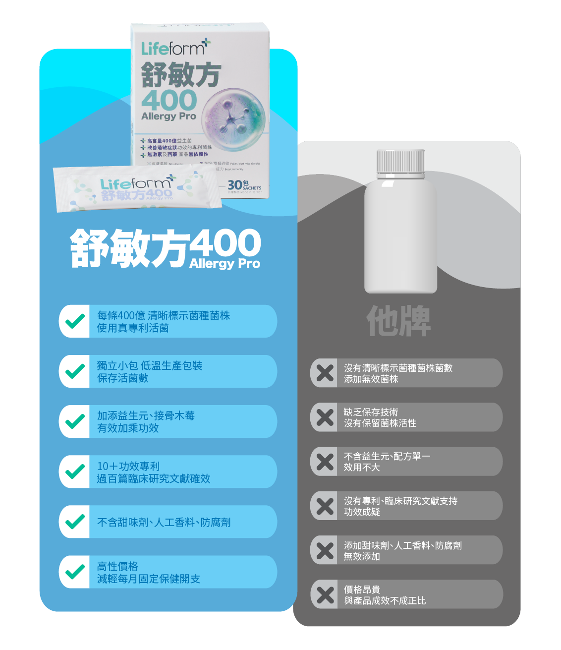 使用多國專利,改善過敏症狀功效的菌株具臨床科學實證適合關注以下問題人士:-皮膚濕敏-呼吸道鼻敏感/氣喘-季節性過敏-花粉/塵蟎過敏-增強免疫力