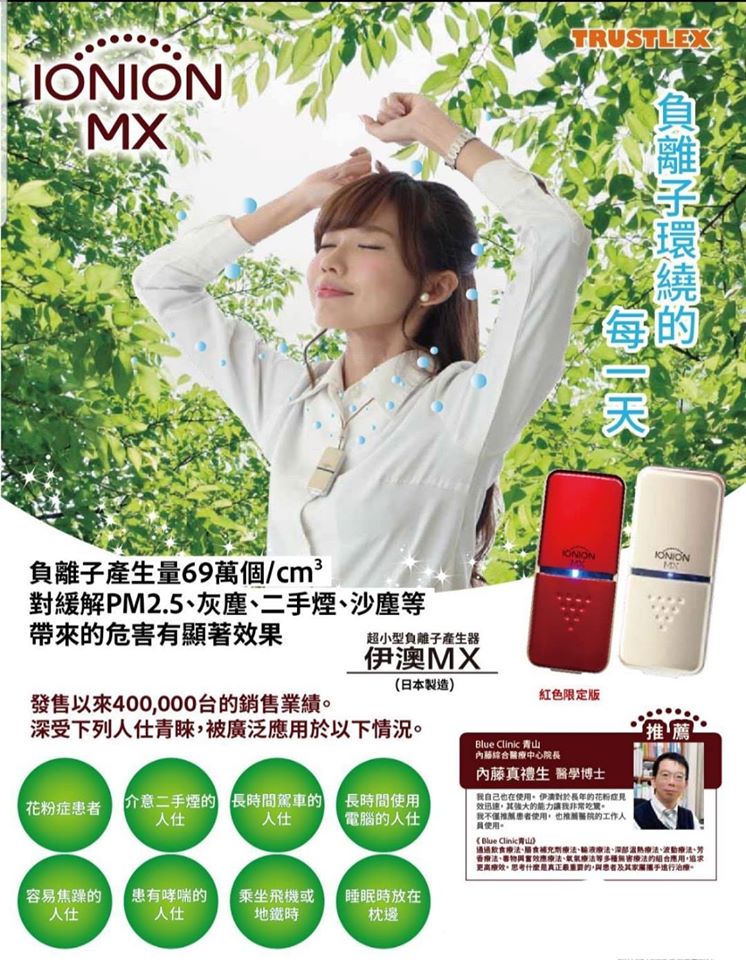 日本IONION MX超輕量隨身空氣清淨機只重20g,係世上最輕巧嘅空氣清新機, 隨身佩戴都無負擔。IONION MX每秒不斷產生69萬氧負離子,有效去除致癌懸浮微粒PM2.5達99.9%,去除致命污染毒物、甲醛達94.6%,令你可以呼吸清新空氣