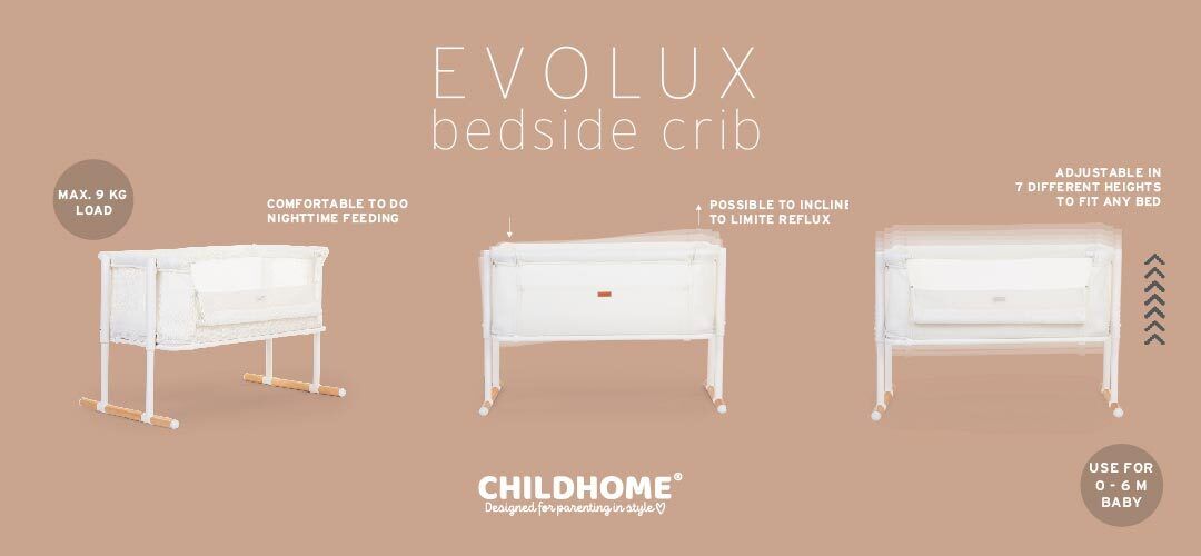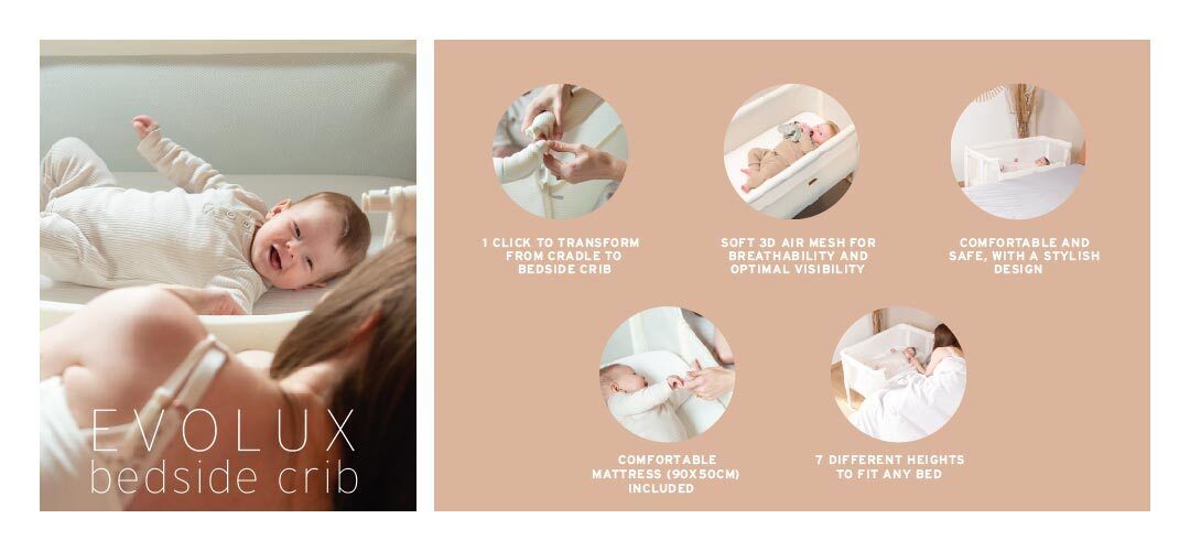Evolux 伴睡床是時尚設計與安全性的完美結合。 對於喜歡在夜間將寶寶留在身邊的父母來說, 使夜間餵奶、護理和安撫變得更加輕鬆和高效。