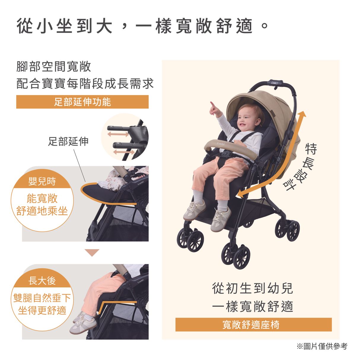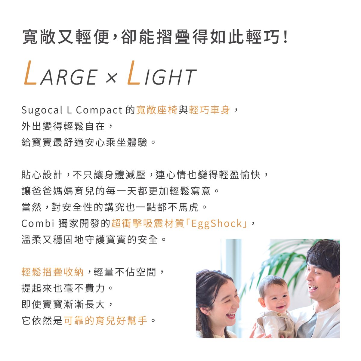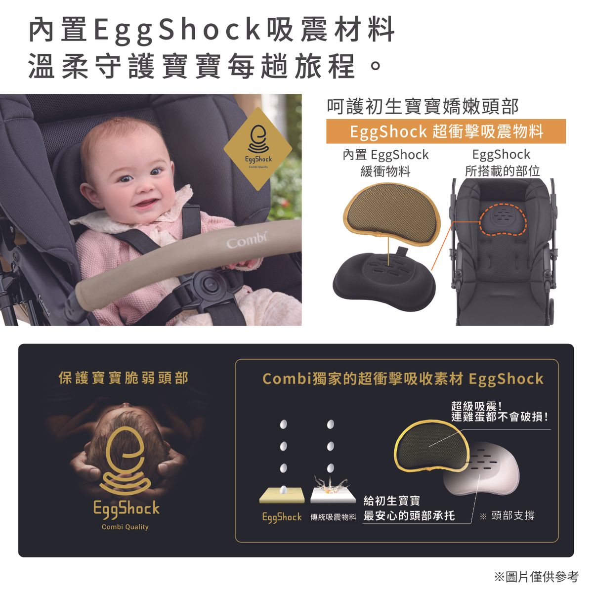 - 使用Combi獨家的超衝擊吸收素材3D EggShock 座墊,守護脆弱的頭部及全身