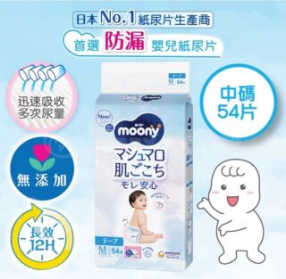 (現金自取 $90x1/$89x2)日本Unicharm Moony超透氣紙尿片 (中碼54片)(6-11kg)