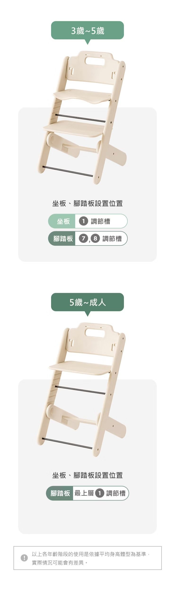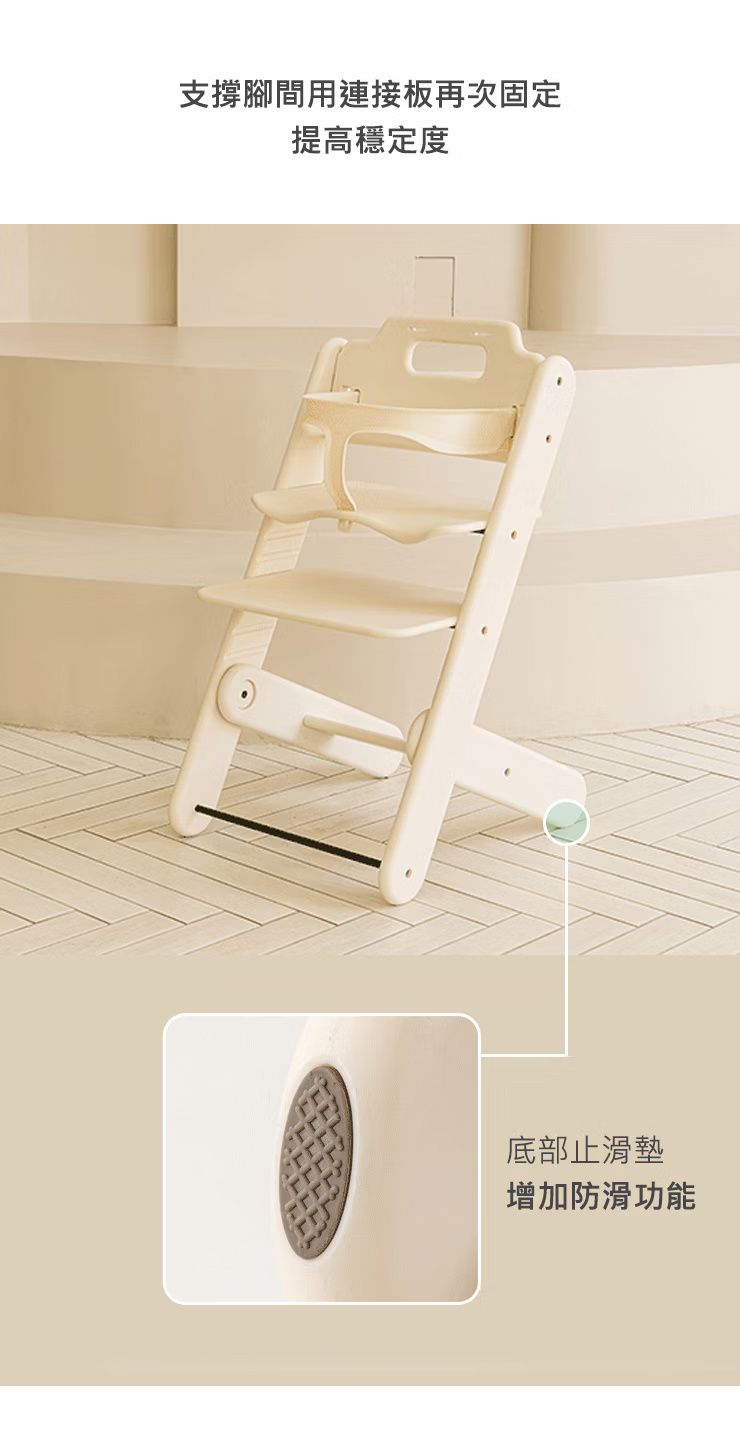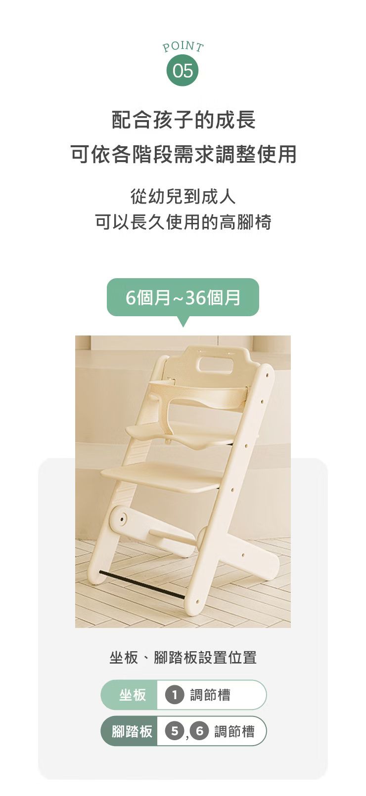 -多階段高腳餐椅:針對各階段寶寶發育需求來調較不同高度的座椅和腳踏,由6個月至 大人都能舒適 地安坐和進食