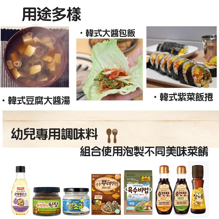- 用途廣泛,除了製作大醬湯,亦可用作沾醬或包飯醬料,日常炒菜或料理亦可用