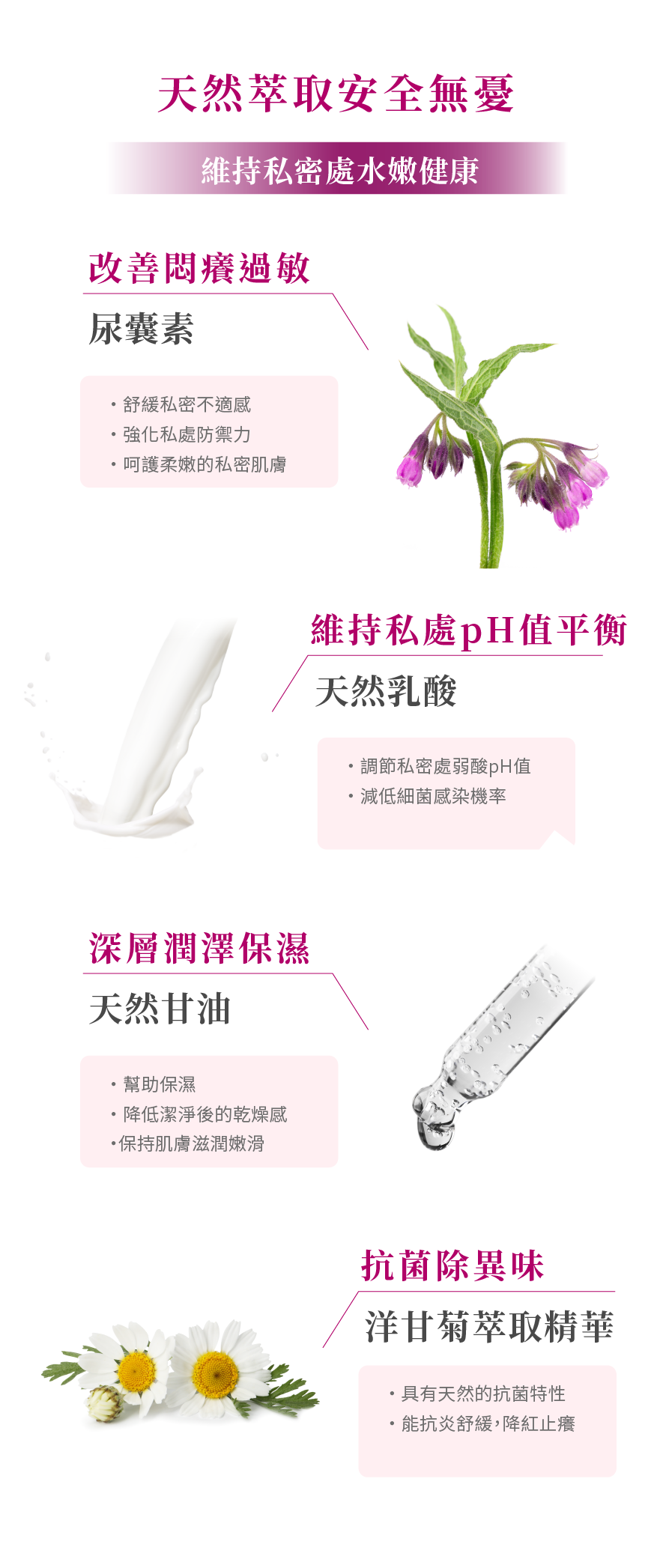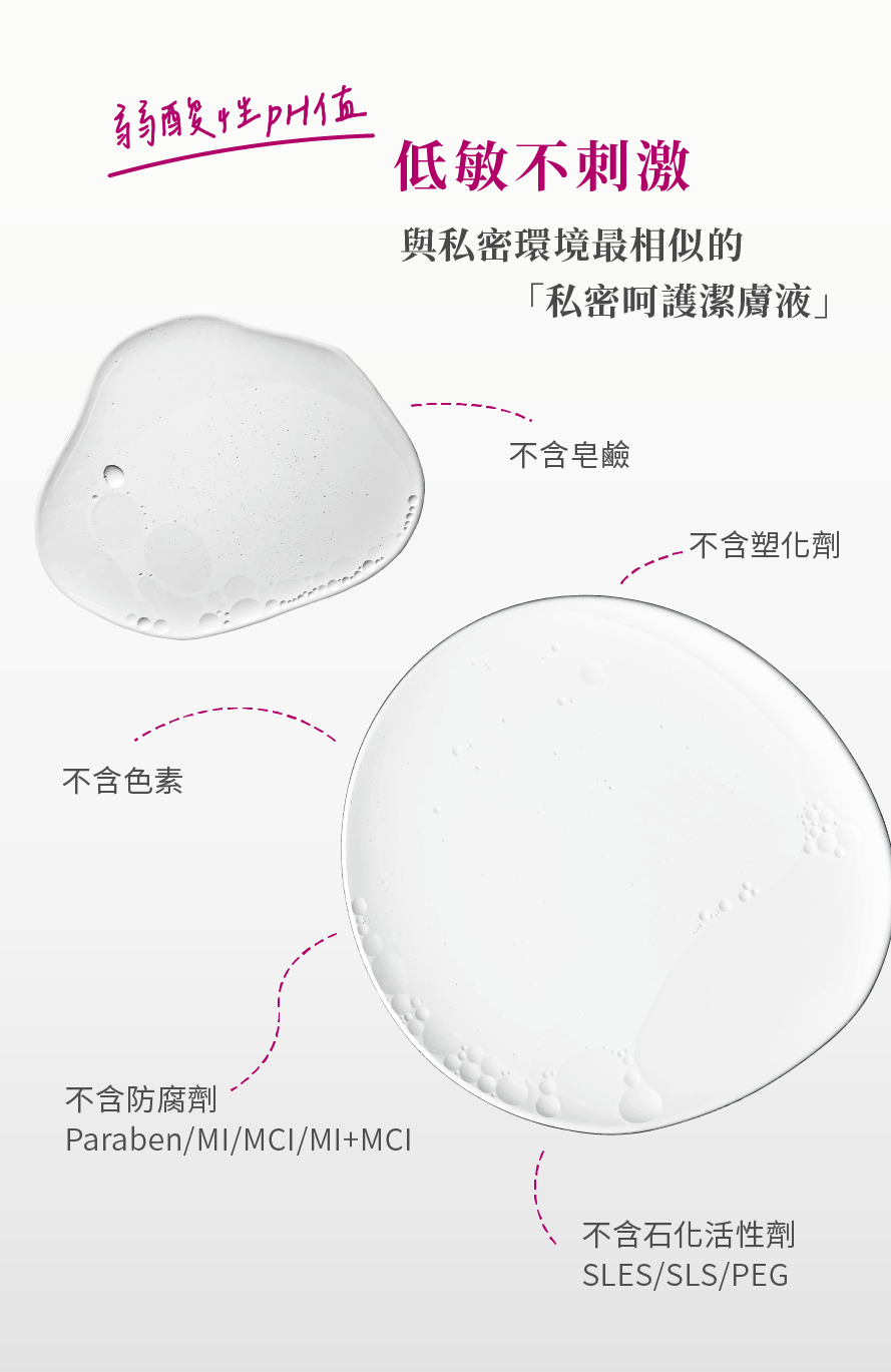 一般以沐浴露清潔又會因內含的鹼性破壞pH,長期使用會破壞保護膜,出現敏感不適、乾癢的問題,因此使用適當的清潔護理劑可有效保護私密部位的肌膚,同時幫助恢復健康的酸鹼值,建立天然的防護力。