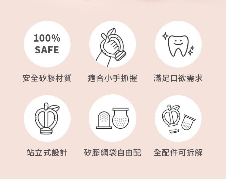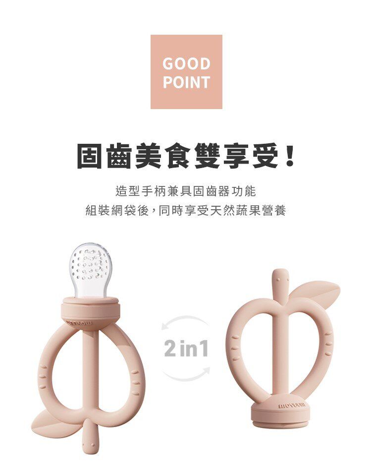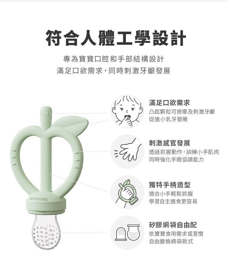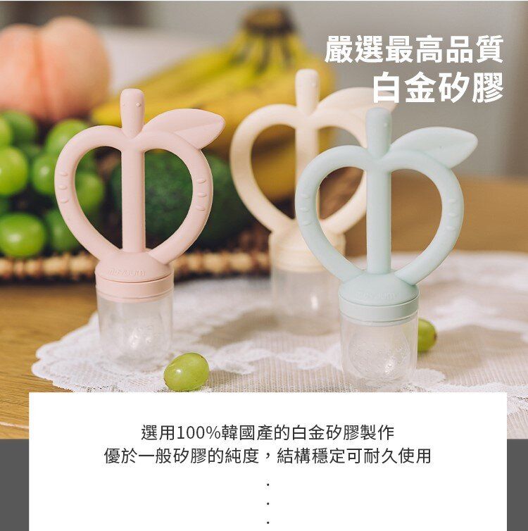 可愛水果造型, 搭配按摩輔食的多功能設計, 讓寶貝一邊滿足口欲期和長牙期的願望, 一邊學習自主進食動作,品嚐營養美食!