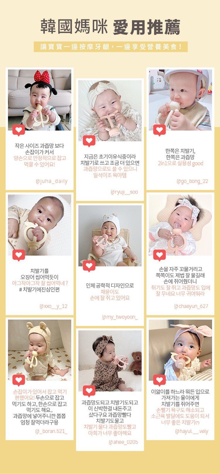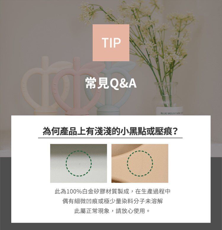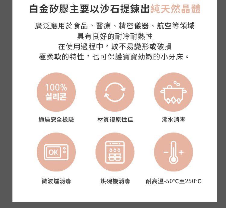 - 極柔軟白金矽膠,貼心保護寶貝幼嫩小牙齦
