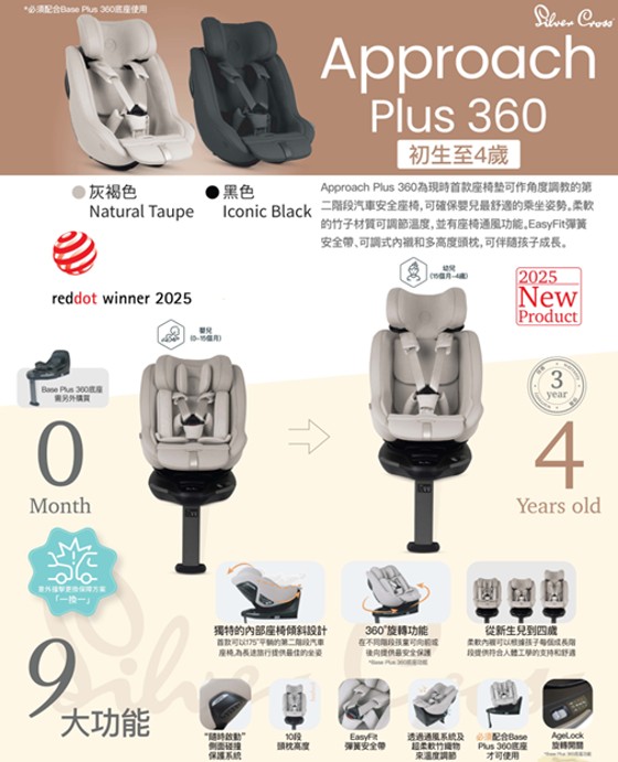 安心無憂,舒適隨行。Approach Plus 360多階段兒童安全座椅專為新生兒至19.5公斤(約4歲)幼童設計,憑藉業界領先的內座艙仰角調節系統,始終為小乘客提供最佳乘坐姿態。搭配Base Plus 360基座(需另行購買),可實現360°全向旋轉、ISOFIX硬接口固定,更配備旋轉鎖定裝置,讓每次出行都輕鬆從容。