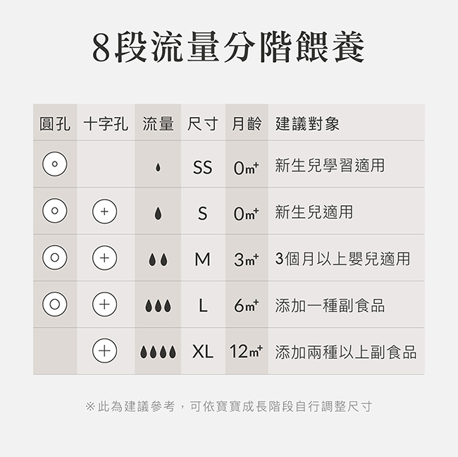 5.防脹氣奶嘴尺寸業界規格最齊全,8段流量分階餵養。