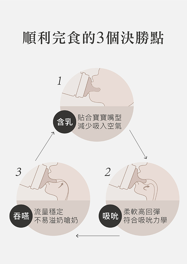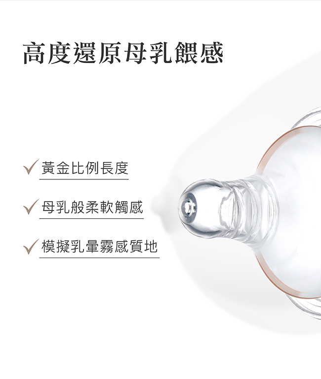 2.高度還原母乳餵感,奶嘴黃金比例長度、柔軟觸感、模擬乳暈霧化設計。