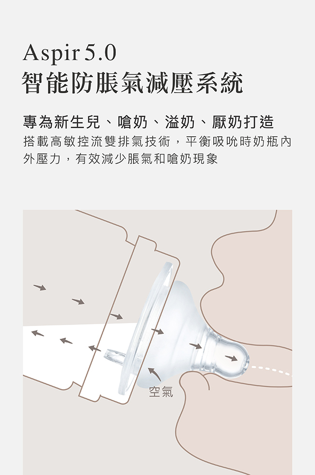 4.Aspir5.0智能防脹氣減壓系統,防嗆奶、防溢奶、防脹氣。